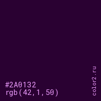 Цвет #2A0132 в цветовой модели RGB обозначается тремя октетами (42, 1, 50) в десятичном формате и #2A0132 в шестнадцатиричном (hex) формате, которые являются интенсивностью красного 42 (hex 2A), интенсивность зелёного 1 (hex 01) и интенсивность синего 50 (hex 32).
