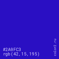 Цвет #2A0FC3 в цветовой модели RGB обозначается тремя октетами (42, 15, 195) в десятичном формате и #2A0FC3 в шестнадцатиричном (hex) формате, которые являются интенсивностью красного 42 (hex 2A), интенсивность зелёного 15 (hex 0F) и интенсивность синего 195 (hex C3).