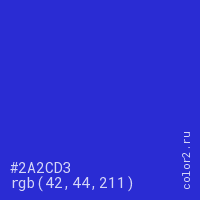Цвет #2A2CD3 в цветовой модели RGB обозначается тремя октетами (42, 44, 211) в десятичном формате и #2A2CD3 в шестнадцатиричном (hex) формате, которые являются интенсивностью красного 42 (hex 2A), интенсивность зелёного 44 (hex 2C) и интенсивность синего 211 (hex D3).