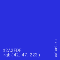 Цвет #2A2FDF в цветовой модели RGB обозначается тремя октетами (42, 47, 223) в десятичном формате и #2A2FDF в шестнадцатиричном (hex) формате, которые являются интенсивностью красного 42 (hex 2A), интенсивность зелёного 47 (hex 2F) и интенсивность синего 223 (hex DF).