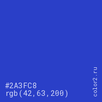Цвет #2A3FC8 в цветовой модели RGB обозначается тремя октетами (42, 63, 200) в десятичном формате и #2A3FC8 в шестнадцатиричном (hex) формате, которые являются интенсивностью красного 42 (hex 2A), интенсивность зелёного 63 (hex 3F) и интенсивность синего 200 (hex C8).