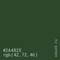 Цвет #2A482E в цветовой модели RGB обозначается тремя октетами (42, 72, 46) в десятичном формате и #2A482E в шестнадцатиричном (hex) формате, которые являются интенсивностью красного 42 (hex 2A), интенсивность зелёного 72 (hex 48) и интенсивность синего 46 (hex 2E).