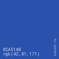 Цвет #2A51AB в цветовой модели RGB обозначается тремя октетами (42, 81, 171) в десятичном формате и #2A51AB в шестнадцатиричном (hex) формате, которые являются интенсивностью красного 42 (hex 2A), интенсивность зелёного 81 (hex 51) и интенсивность синего 171 (hex AB).