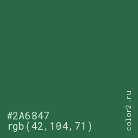 Цвет #2A6847 в цветовой модели RGB обозначается тремя октетами (42, 104, 71) в десятичном формате и #2A6847 в шестнадцатиричном (hex) формате, которые являются интенсивностью красного 42 (hex 2A), интенсивность зелёного 104 (hex 68) и интенсивность синего 71 (hex 47).