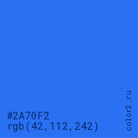 Цвет #2A70F2 в цветовой модели RGB обозначается тремя октетами (42, 112, 242) в десятичном формате и #2A70F2 в шестнадцатиричном (hex) формате, которые являются интенсивностью красного 42 (hex 2A), интенсивность зелёного 112 (hex 70) и интенсивность синего 242 (hex F2).