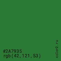 Цвет #2A7935 в цветовой модели RGB обозначается тремя октетами (42, 121, 53) в десятичном формате и #2A7935 в шестнадцатиричном (hex) формате, которые являются интенсивностью красного 42 (hex 2A), интенсивность зелёного 121 (hex 79) и интенсивность синего 53 (hex 35).