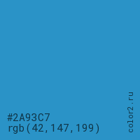 Цвет #2A93C7 в цветовой модели RGB обозначается тремя октетами (42, 147, 199) в десятичном формате и #2A93C7 в шестнадцатиричном (hex) формате, которые являются интенсивностью красного 42 (hex 2A), интенсивность зелёного 147 (hex 93) и интенсивность синего 199 (hex C7).