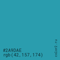 Цвет #2A9DAE в цветовой модели RGB обозначается тремя октетами (42, 157, 174) в десятичном формате и #2A9DAE в шестнадцатиричном (hex) формате, которые являются интенсивностью красного 42 (hex 2A), интенсивность зелёного 157 (hex 9D) и интенсивность синего 174 (hex AE).
