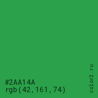 Цвет #2AA14A в цветовой модели RGB обозначается тремя октетами (42, 161, 74) в десятичном формате и #2AA14A в шестнадцатиричном (hex) формате, которые являются интенсивностью красного 42 (hex 2A), интенсивность зелёного 161 (hex A1) и интенсивность синего 74 (hex 4A).