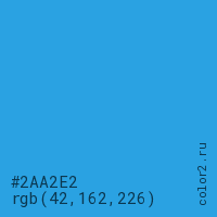 Цвет #2AA2E2 в цветовой модели RGB обозначается тремя октетами (42, 162, 226) в десятичном формате и #2AA2E2 в шестнадцатиричном (hex) формате, которые являются интенсивностью красного 42 (hex 2A), интенсивность зелёного 162 (hex A2) и интенсивность синего 226 (hex E2).
