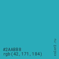 Цвет #2AABB8 в цветовой модели RGB обозначается тремя октетами (42, 171, 184) в десятичном формате и #2AABB8 в шестнадцатиричном (hex) формате, которые являются интенсивностью красного 42 (hex 2A), интенсивность зелёного 171 (hex AB) и интенсивность синего 184 (hex B8).