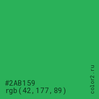 Цвет #2AB159 в цветовой модели RGB обозначается тремя октетами (42, 177, 89) в десятичном формате и #2AB159 в шестнадцатиричном (hex) формате, которые являются интенсивностью красного 42 (hex 2A), интенсивность зелёного 177 (hex B1) и интенсивность синего 89 (hex 59).