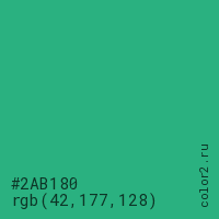 Цвет #2AB180 в цветовой модели RGB обозначается тремя октетами (42, 177, 128) в десятичном формате и #2AB180 в шестнадцатиричном (hex) формате, которые являются интенсивностью красного 42 (hex 2A), интенсивность зелёного 177 (hex B1) и интенсивность синего 128 (hex 80).