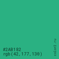 Цвет #2AB182 в цветовой модели RGB обозначается тремя октетами (42, 177, 130) в десятичном формате и #2AB182 в шестнадцатиричном (hex) формате, которые являются интенсивностью красного 42 (hex 2A), интенсивность зелёного 177 (hex B1) и интенсивность синего 130 (hex 82).