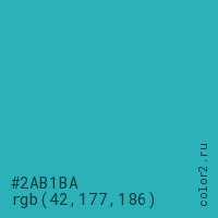 Цвет #2AB1BA в цветовой модели RGB обозначается тремя октетами (42, 177, 186) в десятичном формате и #2AB1BA в шестнадцатиричном (hex) формате, которые являются интенсивностью красного 42 (hex 2A), интенсивность зелёного 177 (hex B1) и интенсивность синего 186 (hex BA).