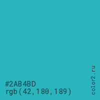 Цвет #2AB4BD в цветовой модели RGB обозначается тремя октетами (42, 180, 189) в десятичном формате и #2AB4BD в шестнадцатиричном (hex) формате, которые являются интенсивностью красного 42 (hex 2A), интенсивность зелёного 180 (hex B4) и интенсивность синего 189 (hex BD).