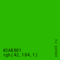 Цвет #2AB801 в цветовой модели RGB обозначается тремя октетами (42, 184, 1) в десятичном формате и #2AB801 в шестнадцатиричном (hex) формате, которые являются интенсивностью красного 42 (hex 2A), интенсивность зелёного 184 (hex B8) и интенсивность синего 1 (hex 01).