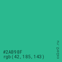 Цвет #2AB98F в цветовой модели RGB обозначается тремя октетами (42, 185, 143) в десятичном формате и #2AB98F в шестнадцатиричном (hex) формате, которые являются интенсивностью красного 42 (hex 2A), интенсивность зелёного 185 (hex B9) и интенсивность синего 143 (hex 8F).