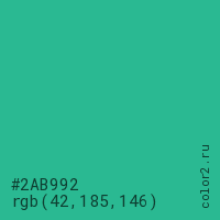 Цвет #2AB992 в цветовой модели RGB обозначается тремя октетами (42, 185, 146) в десятичном формате и #2AB992 в шестнадцатиричном (hex) формате, которые являются интенсивностью красного 42 (hex 2A), интенсивность зелёного 185 (hex B9) и интенсивность синего 146 (hex 92).