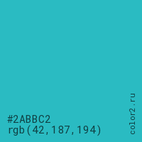 Цвет #2ABBC2 в цветовой модели RGB обозначается тремя октетами (42, 187, 194) в десятичном формате и #2ABBC2 в шестнадцатиричном (hex) формате, которые являются интенсивностью красного 42 (hex 2A), интенсивность зелёного 187 (hex BB) и интенсивность синего 194 (hex C2).