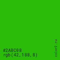 Цвет #2ABC08 в цветовой модели RGB обозначается тремя октетами (42, 188, 8) в десятичном формате и #2ABC08 в шестнадцатиричном (hex) формате, которые являются интенсивностью красного 42 (hex 2A), интенсивность зелёного 188 (hex BC) и интенсивность синего 8 (hex 08).