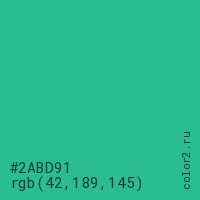 Цвет #2ABD91 в цветовой модели RGB обозначается тремя октетами (42, 189, 145) в десятичном формате и #2ABD91 в шестнадцатиричном (hex) формате, которые являются интенсивностью красного 42 (hex 2A), интенсивность зелёного 189 (hex BD) и интенсивность синего 145 (hex 91).