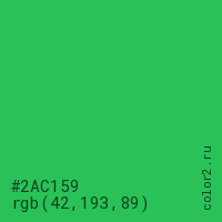 Цвет #2AC159 в цветовой модели RGB обозначается тремя октетами (42, 193, 89) в десятичном формате и #2AC159 в шестнадцатиричном (hex) формате, которые являются интенсивностью красного 42 (hex 2A), интенсивность зелёного 193 (hex C1) и интенсивность синего 89 (hex 59).