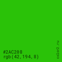 Цвет #2AC208 в цветовой модели RGB обозначается тремя октетами (42, 194, 8) в десятичном формате и #2AC208 в шестнадцатиричном (hex) формате, которые являются интенсивностью красного 42 (hex 2A), интенсивность зелёного 194 (hex C2) и интенсивность синего 8 (hex 08).