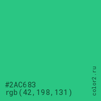 Цвет #2AC683 в цветовой модели RGB обозначается тремя октетами (42, 198, 131) в десятичном формате и #2AC683 в шестнадцатиричном (hex) формате, которые являются интенсивностью красного 42 (hex 2A), интенсивность зелёного 198 (hex C6) и интенсивность синего 131 (hex 83).