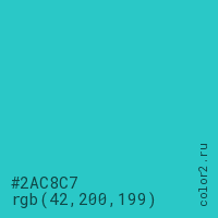 Цвет #2AC8C7 в цветовой модели RGB обозначается тремя октетами (42, 200, 199) в десятичном формате и #2AC8C7 в шестнадцатиричном (hex) формате, которые являются интенсивностью красного 42 (hex 2A), интенсивность зелёного 200 (hex C8) и интенсивность синего 199 (hex C7).