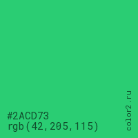 Цвет #2ACD73 в цветовой модели RGB обозначается тремя октетами (42, 205, 115) в десятичном формате и #2ACD73 в шестнадцатиричном (hex) формате, которые являются интенсивностью красного 42 (hex 2A), интенсивность зелёного 205 (hex CD) и интенсивность синего 115 (hex 73).