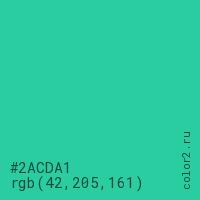 Цвет #2ACDA1 в цветовой модели RGB обозначается тремя октетами (42, 205, 161) в десятичном формате и #2ACDA1 в шестнадцатиричном (hex) формате, которые являются интенсивностью красного 42 (hex 2A), интенсивность зелёного 205 (hex CD) и интенсивность синего 161 (hex A1).