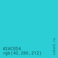 Цвет #2ACED4 в цветовой модели RGB обозначается тремя октетами (42, 206, 212) в десятичном формате и #2ACED4 в шестнадцатиричном (hex) формате, которые являются интенсивностью красного 42 (hex 2A), интенсивность зелёного 206 (hex CE) и интенсивность синего 212 (hex D4).