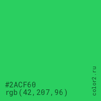 Цвет #2ACF60 в цветовой модели RGB обозначается тремя октетами (42, 207, 96) в десятичном формате и #2ACF60 в шестнадцатиричном (hex) формате, которые являются интенсивностью красного 42 (hex 2A), интенсивность зелёного 207 (hex CF) и интенсивность синего 96 (hex 60).
