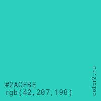 Цвет #2ACFBE в цветовой модели RGB обозначается тремя октетами (42, 207, 190) в десятичном формате и #2ACFBE в шестнадцатиричном (hex) формате, которые являются интенсивностью красного 42 (hex 2A), интенсивность зелёного 207 (hex CF) и интенсивность синего 190 (hex BE).