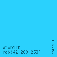 Цвет #2AD1FD в цветовой модели RGB обозначается тремя октетами (42, 209, 253) в десятичном формате и #2AD1FD в шестнадцатиричном (hex) формате, которые являются интенсивностью красного 42 (hex 2A), интенсивность зелёного 209 (hex D1) и интенсивность синего 253 (hex FD).