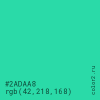 Цвет #2ADAA8 в цветовой модели RGB обозначается тремя октетами (42, 218, 168) в десятичном формате и #2ADAA8 в шестнадцатиричном (hex) формате, которые являются интенсивностью красного 42 (hex 2A), интенсивность зелёного 218 (hex DA) и интенсивность синего 168 (hex A8).