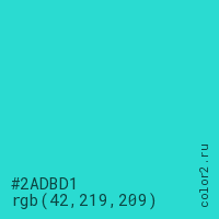 Цвет #2ADBD1 в цветовой модели RGB обозначается тремя октетами (42, 219, 209) в десятичном формате и #2ADBD1 в шестнадцатиричном (hex) формате, которые являются интенсивностью красного 42 (hex 2A), интенсивность зелёного 219 (hex DB) и интенсивность синего 209 (hex D1).