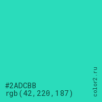 Цвет #2ADCBB в цветовой модели RGB обозначается тремя октетами (42, 220, 187) в десятичном формате и #2ADCBB в шестнадцатиричном (hex) формате, которые являются интенсивностью красного 42 (hex 2A), интенсивность зелёного 220 (hex DC) и интенсивность синего 187 (hex BB).