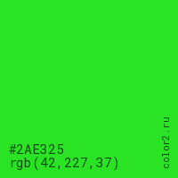 Цвет #2AE325 в цветовой модели RGB обозначается тремя октетами (42, 227, 37) в десятичном формате и #2AE325 в шестнадцатиричном (hex) формате, которые являются интенсивностью красного 42 (hex 2A), интенсивность зелёного 227 (hex E3) и интенсивность синего 37 (hex 25).