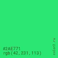 Цвет #2AE771 в цветовой модели RGB обозначается тремя октетами (42, 231, 113) в десятичном формате и #2AE771 в шестнадцатиричном (hex) формате, которые являются интенсивностью красного 42 (hex 2A), интенсивность зелёного 231 (hex E7) и интенсивность синего 113 (hex 71).