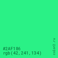 Цвет #2AF186 в цветовой модели RGB обозначается тремя октетами (42, 241, 134) в десятичном формате и #2AF186 в шестнадцатиричном (hex) формате, которые являются интенсивностью красного 42 (hex 2A), интенсивность зелёного 241 (hex F1) и интенсивность синего 134 (hex 86).