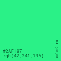 Цвет #2AF187 в цветовой модели RGB обозначается тремя октетами (42, 241, 135) в десятичном формате и #2AF187 в шестнадцатиричном (hex) формате, которые являются интенсивностью красного 42 (hex 2A), интенсивность зелёного 241 (hex F1) и интенсивность синего 135 (hex 87).