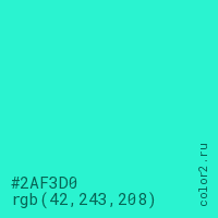 Цвет RGB(42, 243, 208) в процентом отношении количества цвета состоит из 16.5% красного (red), 95.3% зелёного (green) и 81.6% синего (blue).