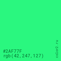 Цвет #2AF77F в цветовой модели RGB обозначается тремя октетами (42, 247, 127) в десятичном формате и #2AF77F в шестнадцатиричном (hex) формате, которые являются интенсивностью красного 42 (hex 2A), интенсивность зелёного 247 (hex F7) и интенсивность синего 127 (hex 7F).