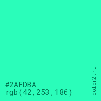 Цвет #2AFDBA в цветовой модели RGB обозначается тремя октетами (42, 253, 186) в десятичном формате и #2AFDBA в шестнадцатиричном (hex) формате, которые являются интенсивностью красного 42 (hex 2A), интенсивность зелёного 253 (hex FD) и интенсивность синего 186 (hex BA).