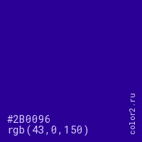 Цвет #2B0096 в цветовой модели RGB обозначается тремя октетами (43, 0, 150) в десятичном формате и #2B0096 в шестнадцатиричном (hex) формате, которые являются интенсивностью красного 43 (hex 2B), интенсивность зелёного 0 (hex 00) и интенсивность синего 150 (hex 96).