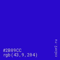 Цвет #2B09CC в цветовой модели RGB обозначается тремя октетами (43, 9, 204) в десятичном формате и #2B09CC в шестнадцатиричном (hex) формате, которые являются интенсивностью красного 43 (hex 2B), интенсивность зелёного 9 (hex 09) и интенсивность синего 204 (hex CC).