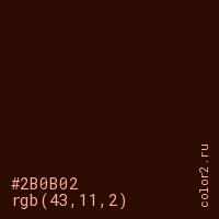 Цвет #2B0B02 в цветовой модели RGB обозначается тремя октетами (43, 11, 2) в десятичном формате и #2B0B02 в шестнадцатиричном (hex) формате, которые являются интенсивностью красного 43 (hex 2B), интенсивность зелёного 11 (hex 0B) и интенсивность синего 2 (hex 02).