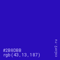 Цвет #2B0DBB в цветовой модели RGB обозначается тремя октетами (43, 13, 187) в десятичном формате и #2B0DBB в шестнадцатиричном (hex) формате, которые являются интенсивностью красного 43 (hex 2B), интенсивность зелёного 13 (hex 0D) и интенсивность синего 187 (hex BB).